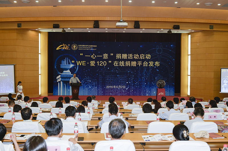 2016年6月2日,时值北京交通大学120周年校庆倒计时100天之际,我校120周年校庆“一心一意”捐赠活动启动暨“WE.爱120”在线捐赠平台发布仪式在科学会堂隆重举行。校党委书记曹国永、校长宁滨等在校校领导、校友代表、师生代表和媒体代表出席,仪式由副校长陈峰主持。